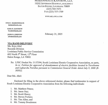 The Guidroz family filed a formal objection to SLECA’s plan to abandon the power lines serving Lake Decade, arguing that SLECA dismantled the lines without authority and reversed years of written commitments promising restoration after storms. They explain that camp owners have relied on this power for decades and have invested heavily in their camps based on SLECA’s assurances. The filing details severe financial harm caused by long-term generator use, notes that FEMA would fund 90% of a rebuild, and claims SLECA ignored viable alternatives like microgrids. The family asks the Public Service Commission to order SLECA to restore the lines or provide another reliable power solution.