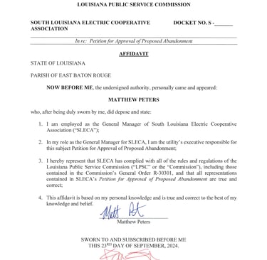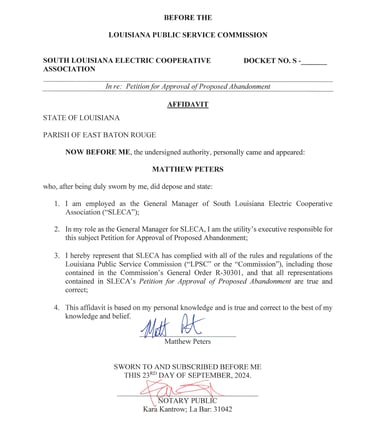 This affidavit, executed by Matthew Peters, General Manager of SLECA, affirms that he is the executive responsible for the Petition for Approval of Proposed Abandonment filed with the Louisiana Public Service Commission. Peters states that SLECA has complied with all LPSC rules and regulations, including General Order R-30301, and that all statements in the petition are true and correct based on his personal knowledge. The affidavit is sworn before Notary Kara Kantrow on September 23, 2024.