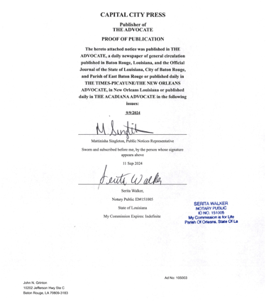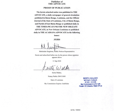 SLECA Public Notice – Proofs of Publication & Affidavits (September 2024)