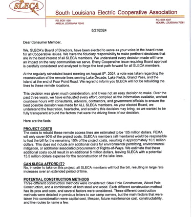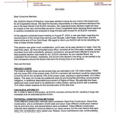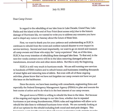 The letter explains that SLECA remains heavily engaged in storm recovery efforts across its service area and emphasizes that camp owners have not been forgotten. SLECA has been working with consultants, engineering firms, and FEMA to determine the best method for rebuilding the lines to withstand future hurricane-force winds.