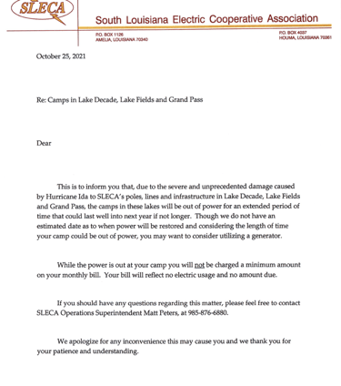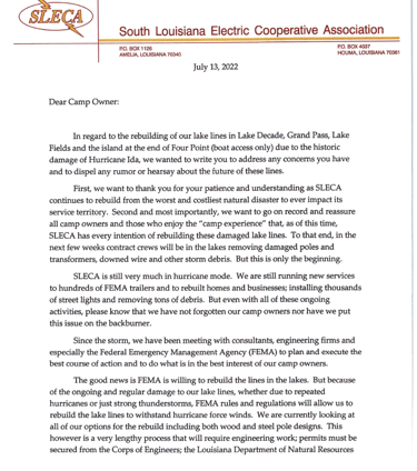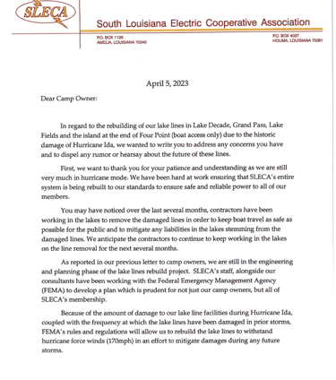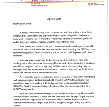 SLECA addresses camp owners regarding the status of the damaged lake power lines in Lake Decade, Grand Pass, Lake Fields, and Four Point after Hurricane Ida. The cooperative reassures residents that it fully intends to rebuild all lake lines and has already begun contracting crews to remove debris and damaged infrastructure.