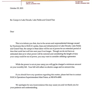 SLECA informs camp owners in Lake Decade, Lake Fields, and Grand Pass that, due to severe and unprecedented damage from Hurricane Ida, power to camps in these areas will be out for an extended period—potentially lasting well into the following year.