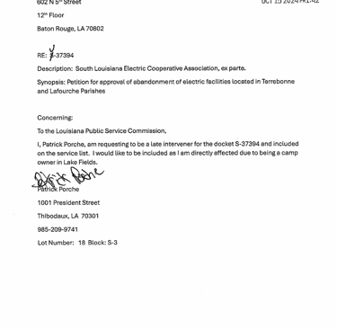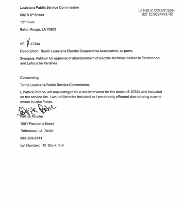 Patrick Porche requests approval to be added as a late intervenor in LPSC Docket S-37394, involving SLECA’s petition to abandon electric facilities in Terrebonne and Lafourche Parishes. He states he is directly affected as a camp owner in Lake Fields and asks to be placed on the service list. The letter includes his address, lot details, and contact number.