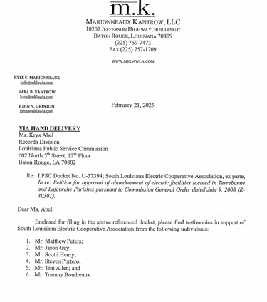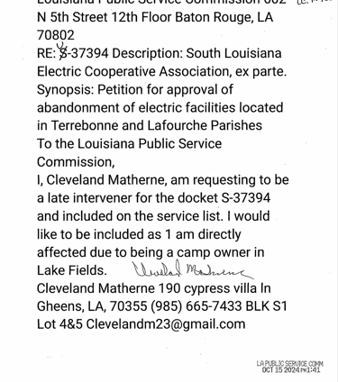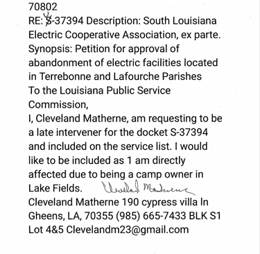 Cleveland Matherne submits a formal request to the Louisiana Public Service Commission to be added as a late intervenor in Docket S-37394 concerning SLECA’s petition to abandon electric facilities in Terrebonne and Lafourche Parishes. Matherne states he is directly affected as a camp owner in Lake Fields and requests to be added to the service list. His contact information and address are provided.