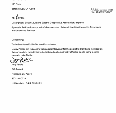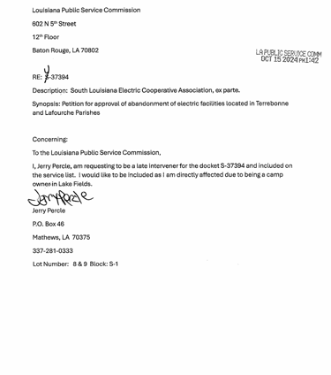 Jerry Percle submits a formal request to be added as a late intervenor in LPSC Docket S-37394, which concerns SLECA’s petition to abandon electric facilities in Terrebonne and Lafourche Parishes. He states that he is directly affected as a camp owner in Lake Fields and asks to be included on the service list. The document includes his mailing address, lot information, and contact number.