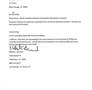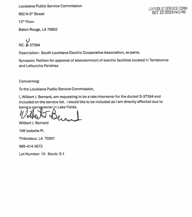 Wilbert J. Bernard requests to be added as a late intervenor in LPSC Docket S-37394 concerning SLECA’s petition to abandon electric facilities in Terrebonne and Lafourche Parishes. He states he is directly affected as a camp owner in Lake Fields and asks to be added to the service list. The letter includes his address, contact information, and lot/block details (Lot 10, Block S-1).