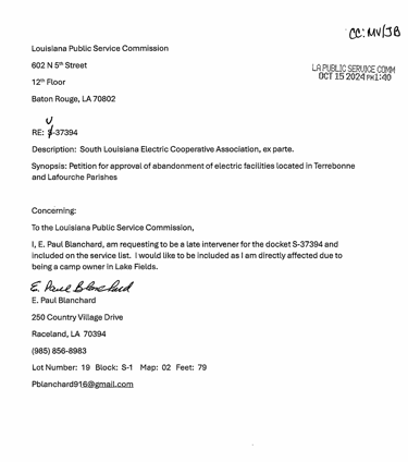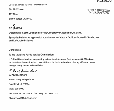 E. Paul Blanchard submits a formal request to be added as a late intervenor in LPSC Docket S-37394 involving SLECA’s petition to abandon electric facilities in Terrebonne and Lafourche Parishes. Blanchard states he is directly affected as a camp owner in Lake Fields and asks to be placed on the service list. The document includes his mailing address, lot information, phone number, and email.
